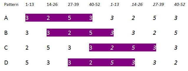The pattern of the placement of the 4 classes was also invariant, but “shifted” from one to the next. The following chart shows the patterns twice to depict the “wrap-around” of the basic order. Note the trippy “knight’s move” shift across the four patterns A – D.